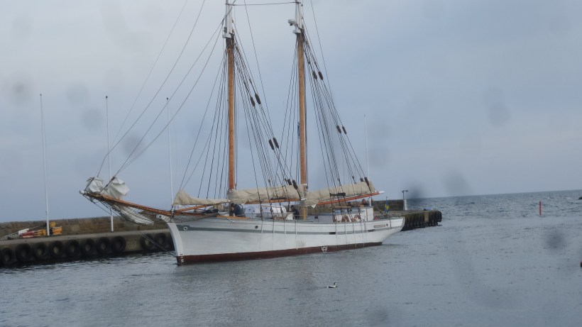 -Vi har nu lagt till i Skillinge, strax/litt söder om Simrishamn. I slutet av 1800-talet fanns det väldigt många skutor, som hade Skillinge som hemmahamn. Jag kan bara tänka på vilka hamnar, som de besökte…. Bifogar/Vedlegger karta över var vi befinner oss, miljön omkring oss, inklusive den flotta skonare, som kom in strax efter oss, och till slut den tidlösa varelsen, som blickar ut över havet.
