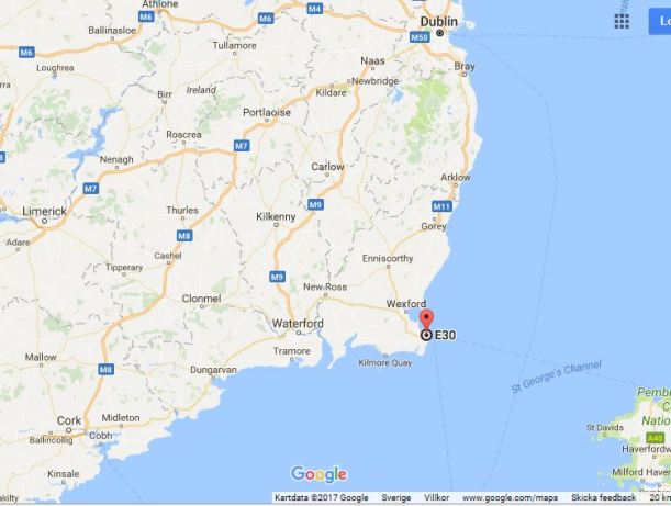 Sååå, nu ligger vi säkert förtöjda i Rosslare’s industrihamn. Det var inte precis hit vi skulle, utan till Kilmore Quay, just efter udden. Rosslare har vi dock haft med som en möjlig nödhamn, om vi skulle få problem. – Det är dock inte särskilt angenämt att som seglare ligga i en oljig och skitig industrihamn med silldoftande trålare samt trimmertravar med kringflygande skräp som närmaste grannar! I en nödsituation accepterar man dock nästan vad som helst, bara man får förtöja tryggt.