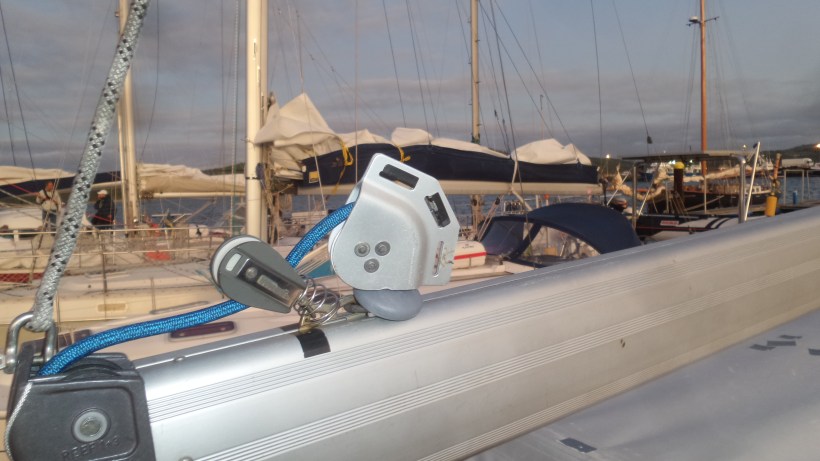 Strax efteråt hörs en väldig smäll i riggen. Först trodde jag att en dörr smällt igen ombord i sjögången, men fann snart att storseglet fladdrade på ett onormalt sätt. Det visade sig att det s.k. skothornet, dvs. storseglets bakersta trekant, hade lossnat från sin infästning i uthalet. För att rädda storseglet och inte låta det blåsa sönder, var det bara att rulla in det i masten och fortsätta mot vårt mål Camariñas, nu med bara genuan. Det gick det också, men det gungade rejält. Vi använder storseglet till större delen för att stabilisera båten, få den att inte rulla så väldigt utan i stället gå stadigare. Nåväl, lite gungigt blev det, men det gick att komma fram och till slut förtöja i den lilla hamnen i Camariñas.