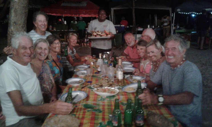 Vi blev inviterade till grannbordet av ett gäng glada australiensare. Snart var snacket igång, och med vinet kom snart också sångerna. Möjligen också sångförmågan. Vi från S/Y Helmi erbjöd oss att bidra med ett litet kulturell inslag. Stormande applåder. – Så klämde vi i med ”Vem kan segla förutan vind” och ”Gubben Noak” och annat känsligt. Vi sjöng tvåstämmigt, minst. Artiga/høfliga applåder. – Sedan drog australiensarna igång med ”Walzing Mathilda” så det dånade mellan palmerna. Allmänt jubel och alla sjöng med. Kvällen avslutades i en härlig stämning, och så blev vi skjutsade tillbaka till båten.