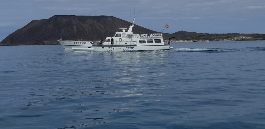 En lokal liten turbåt tar turister från Corralejo på närbelägna Fuerteventuras nordkust.
