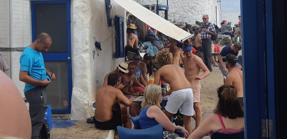 Utanför restaurangen, längs med Huvudgatan, som vid högvatten sköljdes över av vågorna, hade ett gäng glada spanska ungdomar samlats med några gitarrer.