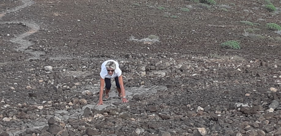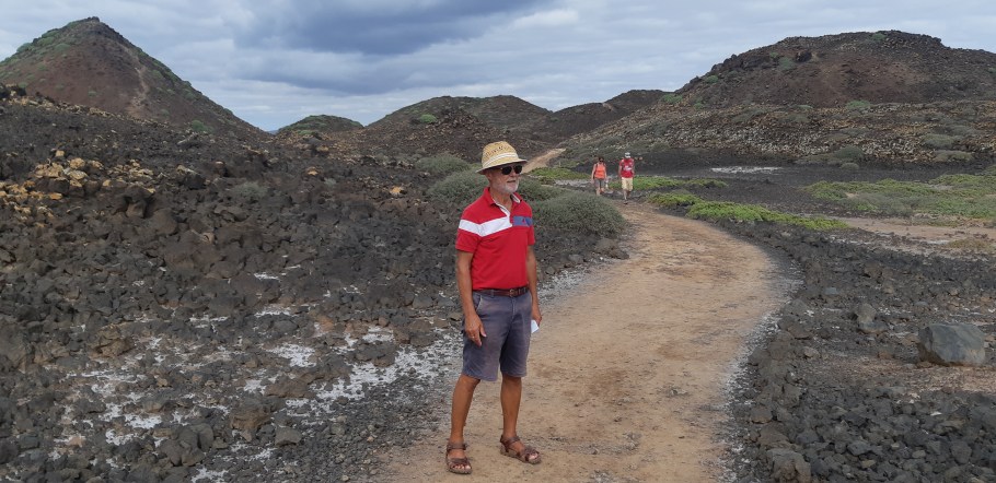 Ön är mycket karg, men det finns små fina vägar, som man ställt i ordning för turisterna. Vi följde en av dem till vulkanens fot. – På vägen dit fann vi de kvadratiska resterna efter utvinningen av havssalt.