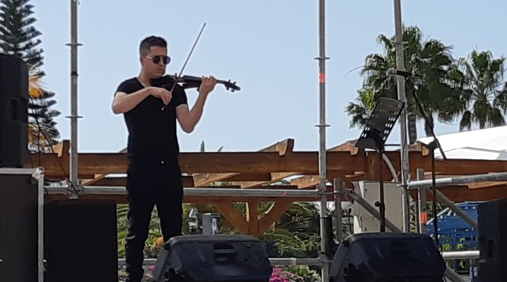 Som kontrast fick vi också med en ensam violinist på en estrad, där han spelade ett vackert stycke av Schubert. Mästerligt!