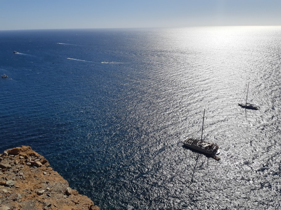 En betagande utsikt utöver havet med några båtar för ankare i förgrunden, andra på väg bort. Själv blir jag alltid så fascinerad av detta att ”havet har diamanter på sig”.