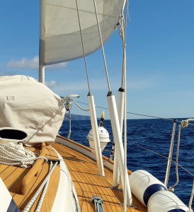 På väg under segel. Solen har tittat fram, och vindarna är ännu svaga. Under seglet syns dingen/jollen, som ligger ihoprullad under segelsäckar för att skydda mot solens skarpa UV-strålar. – Den vita kulan förut är en ankarboj, som fästes i ankarets bakkant, och som markerar var vårt ankare ligger. Dessutom kan den fungera som en ”tripp-line” för att kunna dra ankaret baklänges, om det skulle fastna i ett klippskrev.