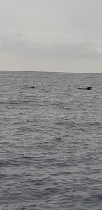 Vi hade sällskap av ett helt stim med Delfiner, som hoppade just omkring oss. Vi lyckades inte få någon bra närbild, bara denna, där man på avstånd ser två individer på lite håll. De verkar så stora, så jag undrar om det kan röra sig om tumlare.