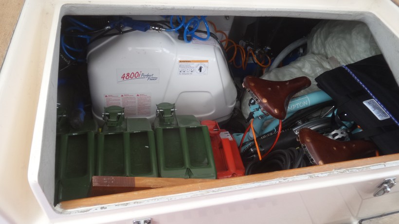 I sittbrunnsstuven finns en liten Fischer-Panda dieselgenerator. Dessutom syns våra Brompton-cyklar, extra dieseldunkar och säckar med 50 meter lina vardera. Längst in skymtar ett extraankare samt en liten kompressor. Allt fastsurrat. Inget tungt får röra sig, när det går sjö!